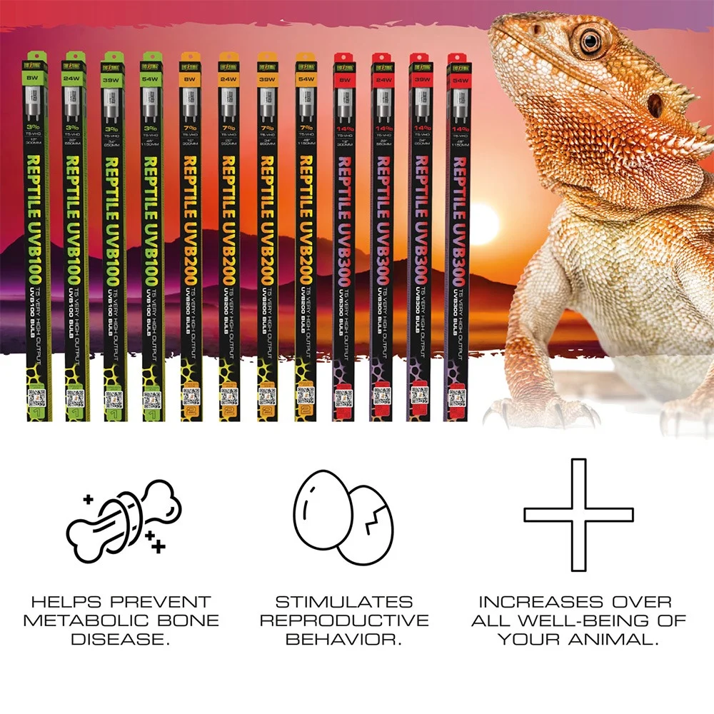 The Exo Terra Reptile UVB200 T5 Very High Output (VHO) Bulb is a specialised UVB and UVA light designed for reptiles that bask occasionally or in partial sunlight, typically inhabiting the Mesophotic Zone. It replicates vital parts of the sunlight spectrum to support Vitamin D3 synthesis, calcium absorption, and overall health. This bulb is available in a range of sizes, including 8W (12″), 24W (22″), 39W (34″), and 54W (46″), making it suitable for various terrarium setups.